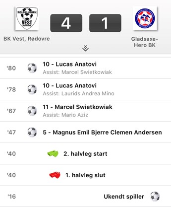 Efter 3-1 scoringen gik gæsterne helt ned og det blev relativt nemt for drengene at kører sejren hjem, men vi skulle da ikke snydes for et mål mere fra topscoreren, Marcel spillede nemlig Lucas helt fri inde foran mål og Lucas satte bolden sikkert ind til slutresultatet 4-1.