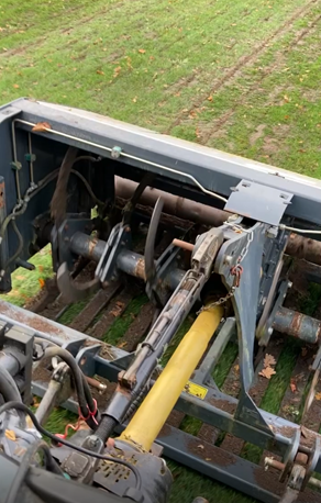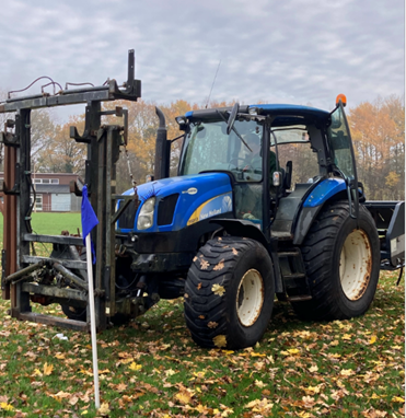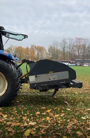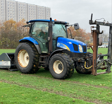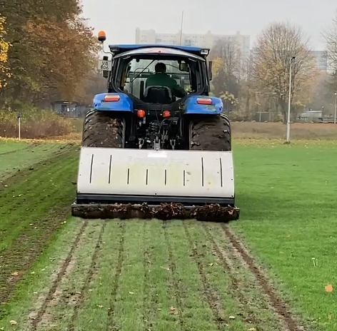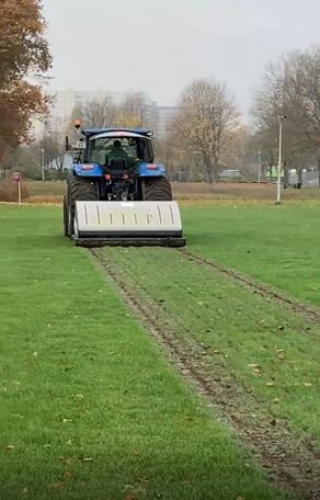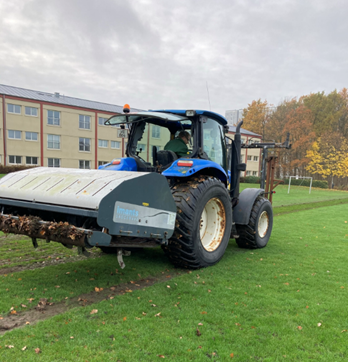 På billederne ses en ordentlig krabat af en traktor som er i gang med at dybelufte fodboldbanen.